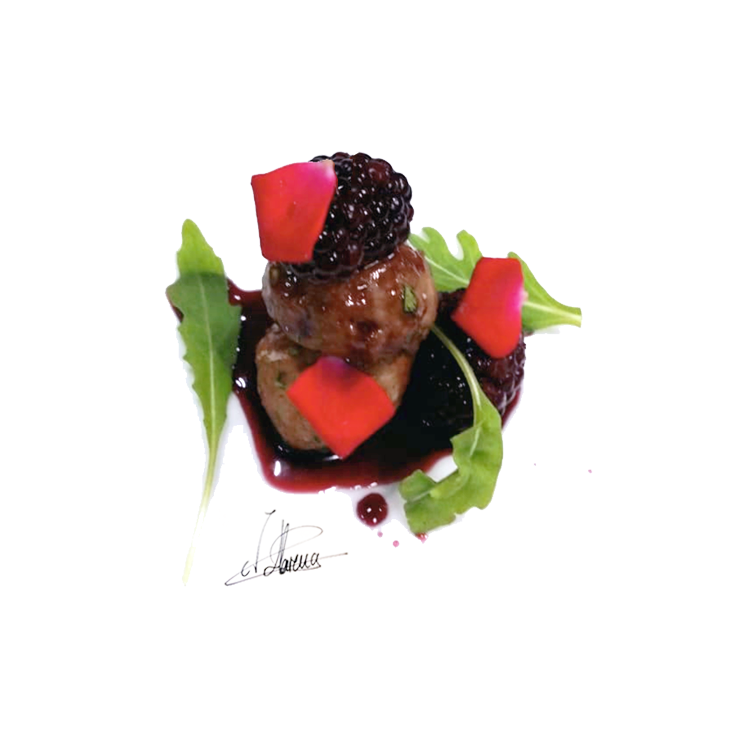 Brocheta de albóndiga de “carne cabra” con rosas, romero, moras y espárragos.