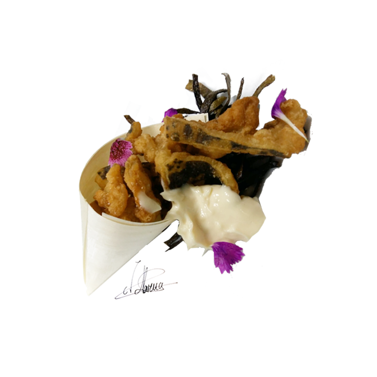 Chicharrones de morena frita con harina de algarroba, alioli de papaya y lima, y mezcal.