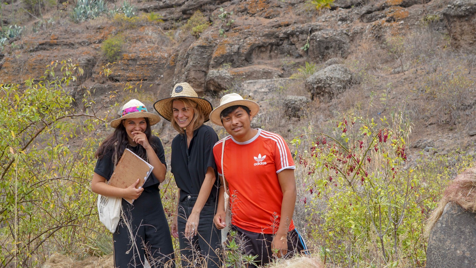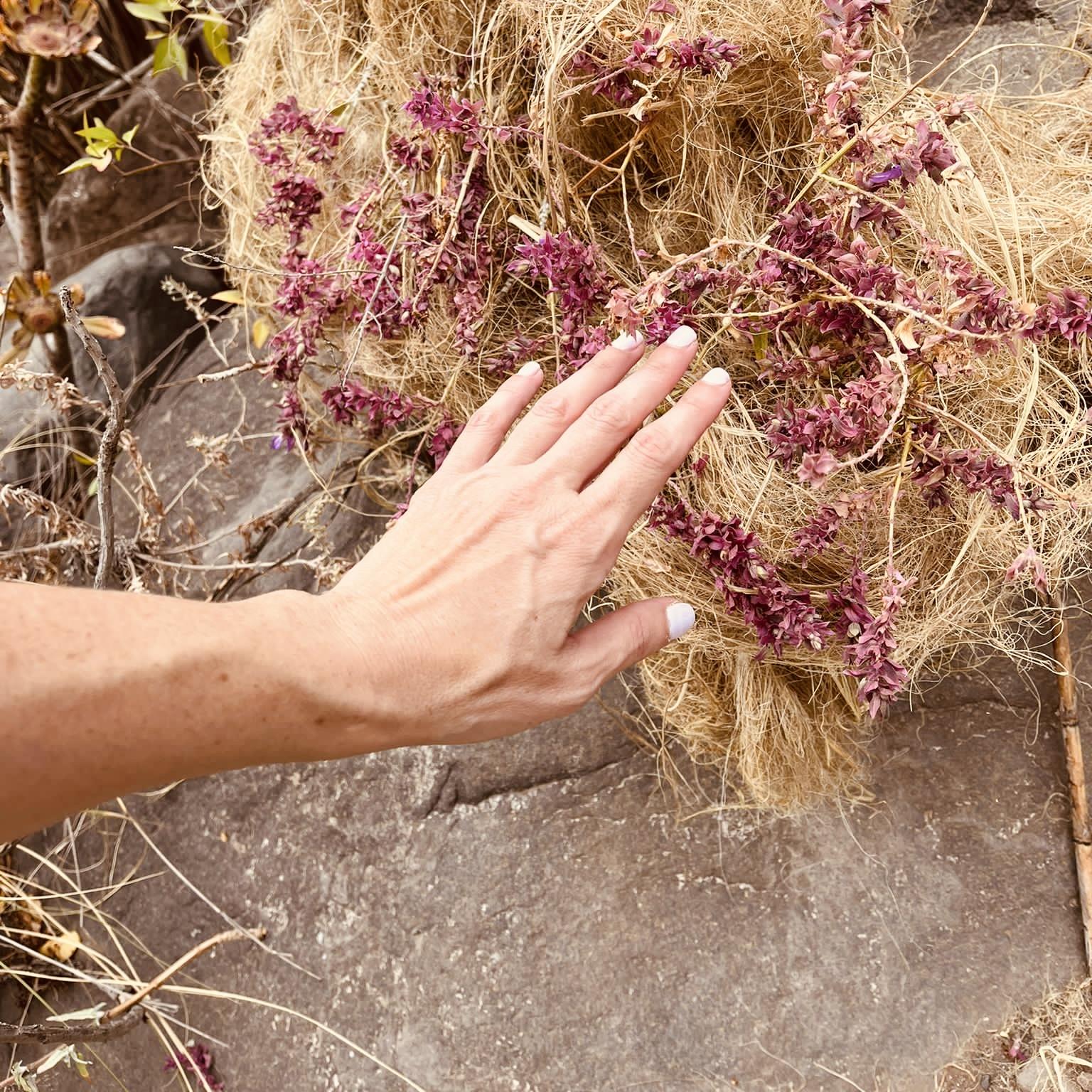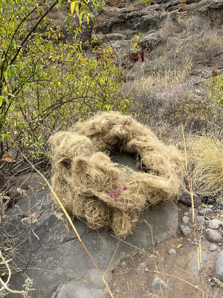 La intervención, al igual que la tela de la araña que puebla las tuneras, es un captador de aromas que descubrimos a lo largo de este recorrido, y que se concentran en ovillos o madejas de hilos y aromas entretejidos que se disponen alrededor de la gran piedra.