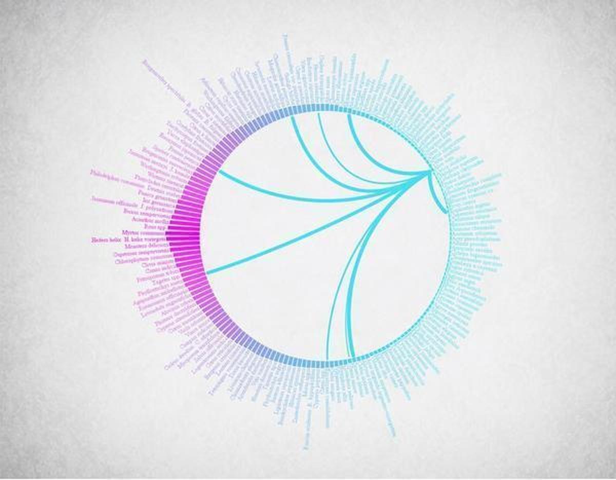 Una vez realizados estos cálculos previos se ha generado una salida visual de la información a través de Processing. Para ello se han estructurado los datos generados en el perímetro de una circunferencia con 187 nodos (que se relacionan con las especies identificadas). Paralelamente se han escalado dichos nodos mediante una ecuación logarítmica, en función de la frecuencia de aparición de las especies.